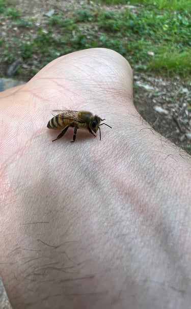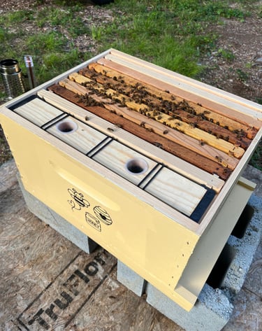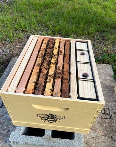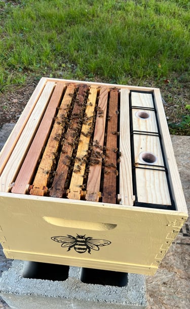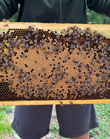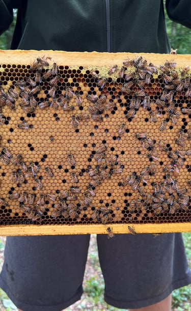 We have grown from one hive in 2022 to 3 hives in 2026! Our bees collect pollen and nectar locally around Taylor Road and produce pounds of delicious golden honey every spring.